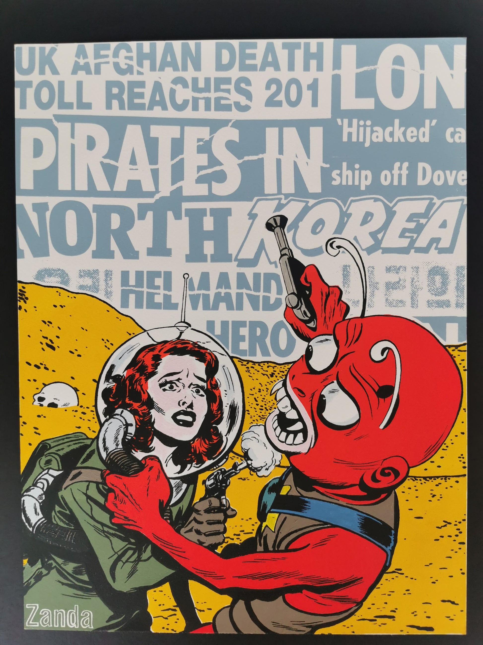 With a style straight out the 50's and 60's American love for Sci-Fi comics, the image depicts a woman confronting a menacing, red-skinned alien creature. This scene could symbolize the challenges and dangers faced by those involved in the Afghan War, both from alien enemies. Overall, the image seems to convey a sense of chaos, conflict, and uncertainty during the Afghan War, combining real-world news events with a fictional, science fiction element.